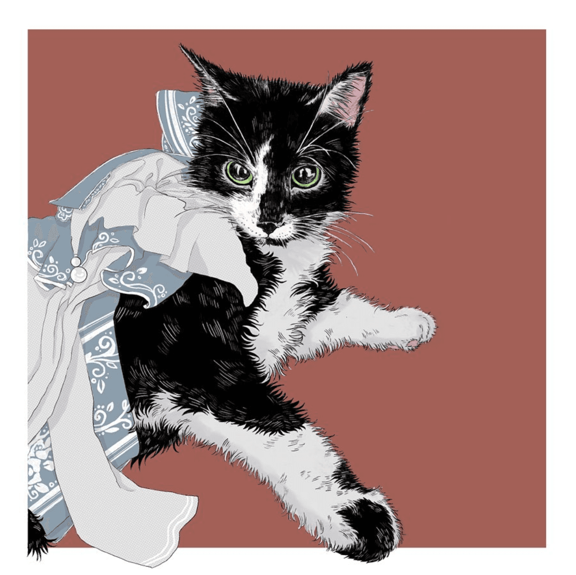 I work with acrylic, ink, watercolor, and also create many illustrations on my iPad.