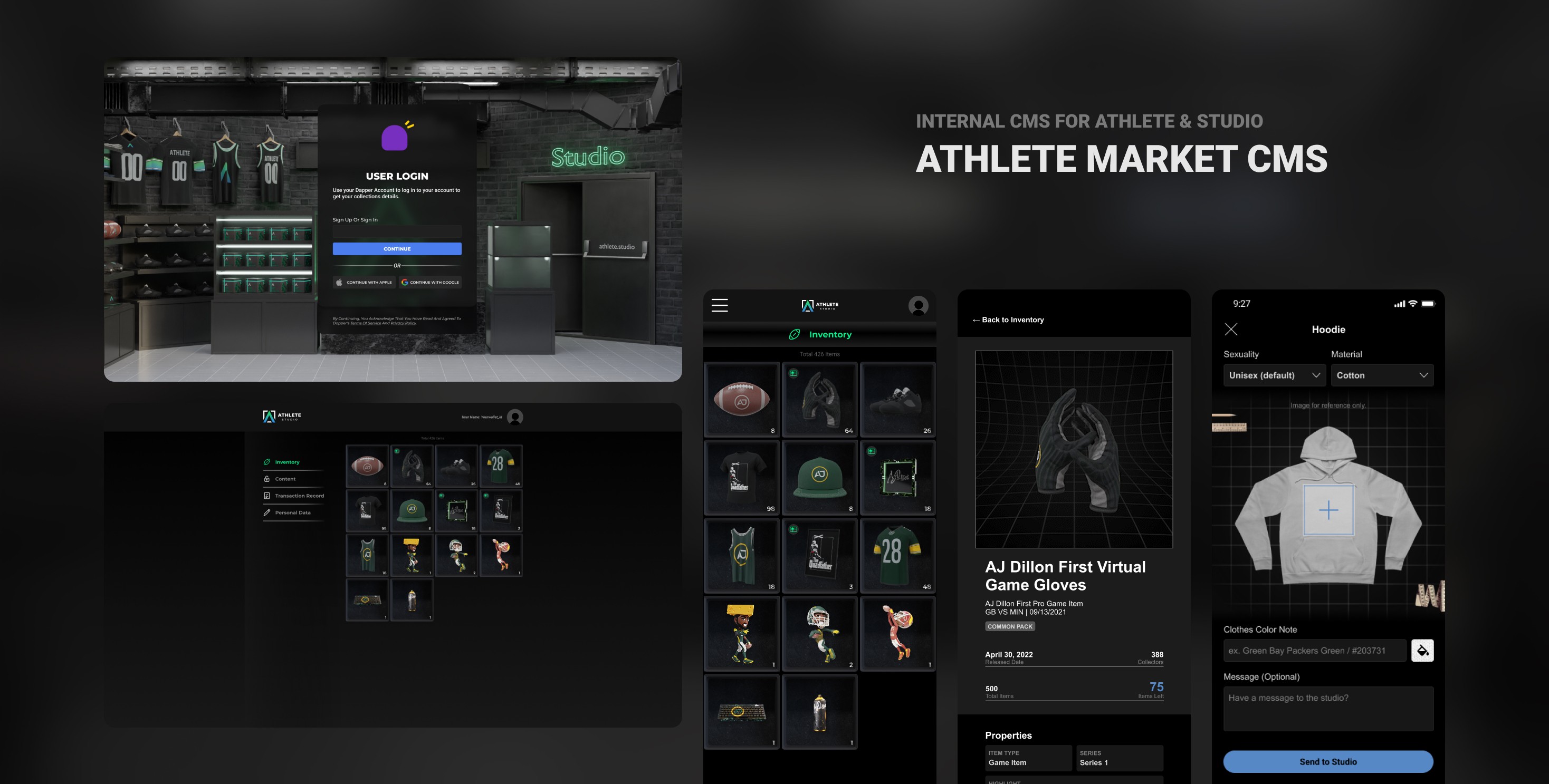 I also led the design of an internal athlete marketplace CMS, a communication platform connecting The Studio and athletes. The app allows athletes to set website style preferences, submit requests, and track updates in real time, while The Studio can manage changes and deliver updates efficiently. Athletes can also request both physical merchandise and virtual NFT products, with the entire design, review, and feedback process centralized within the platform. My role focused on defining user flows, UI, interactive prototypes, and demos.
