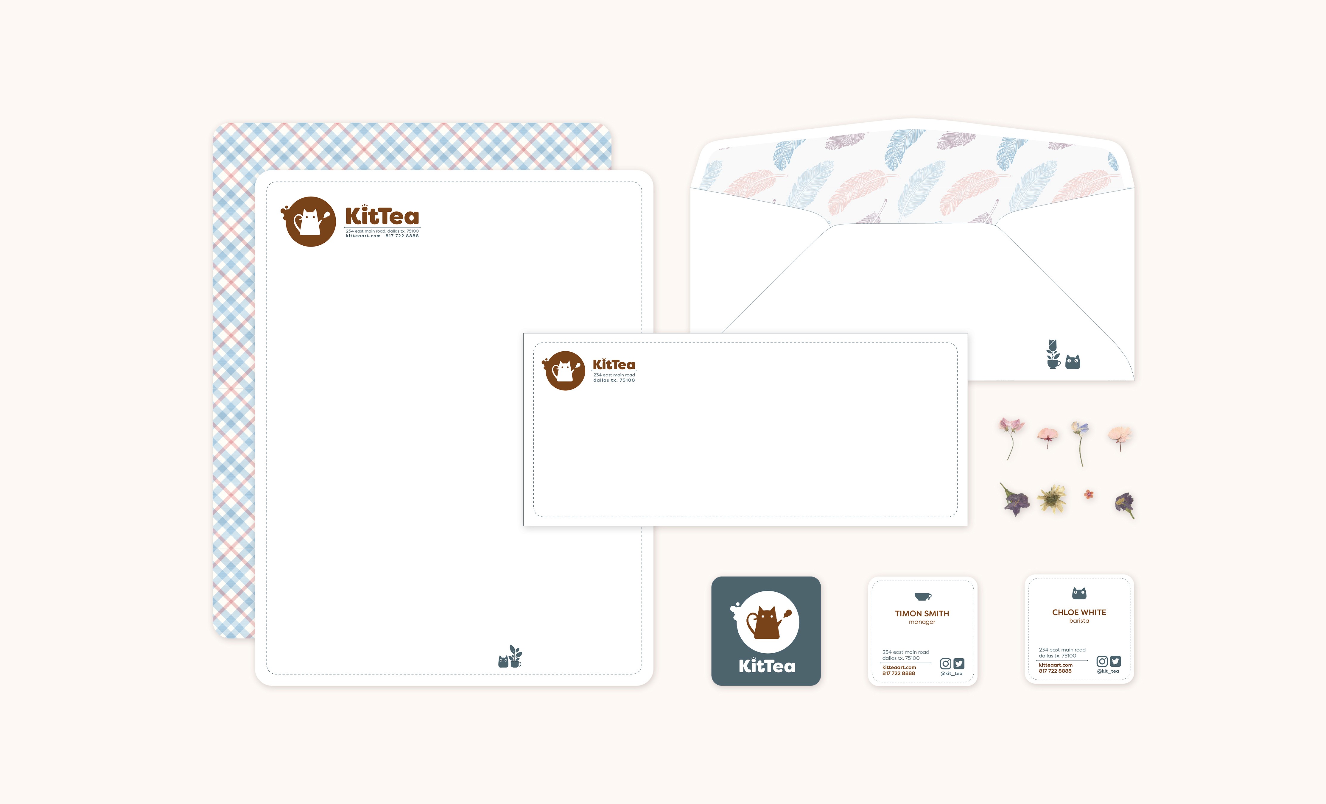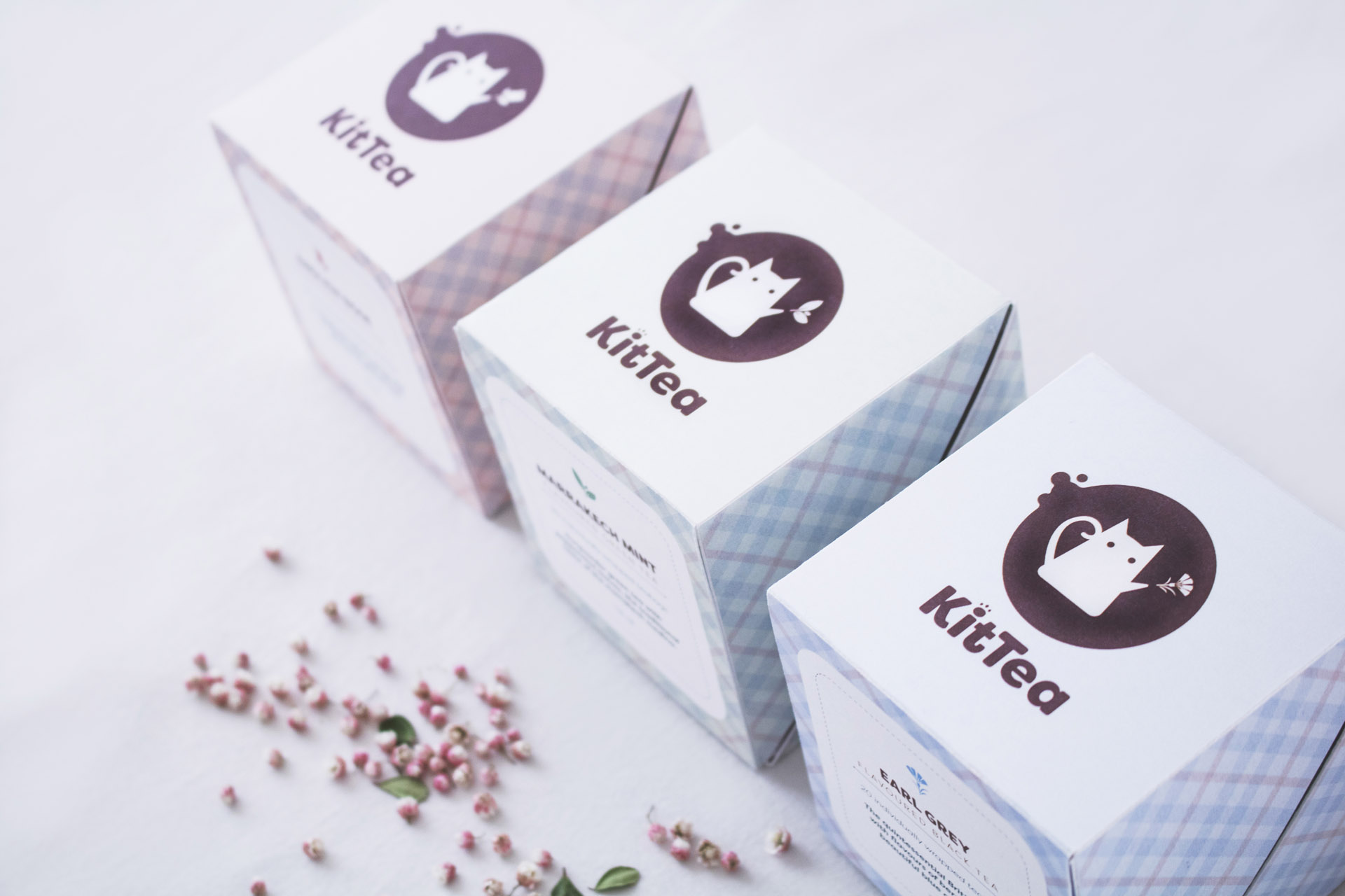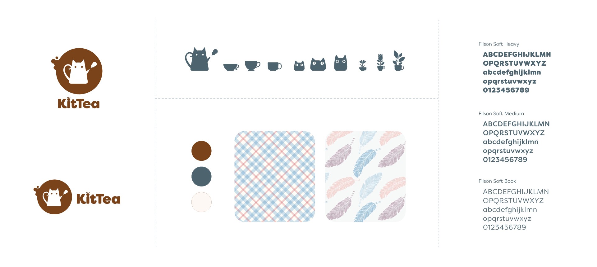 KitTea's color palette includes brown - the color of tea, navy - the color of night, and cream - the color represents soft and warm sunshine. The pattern of feathers represents the playful and cuteness of the kitten. Its iconography contains the teapot, teacups, kittens, and icons of various teas. Filson Soft font is round and cute, which gives people a friendly and cheerful feeling.