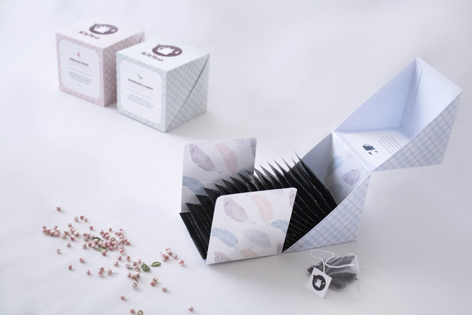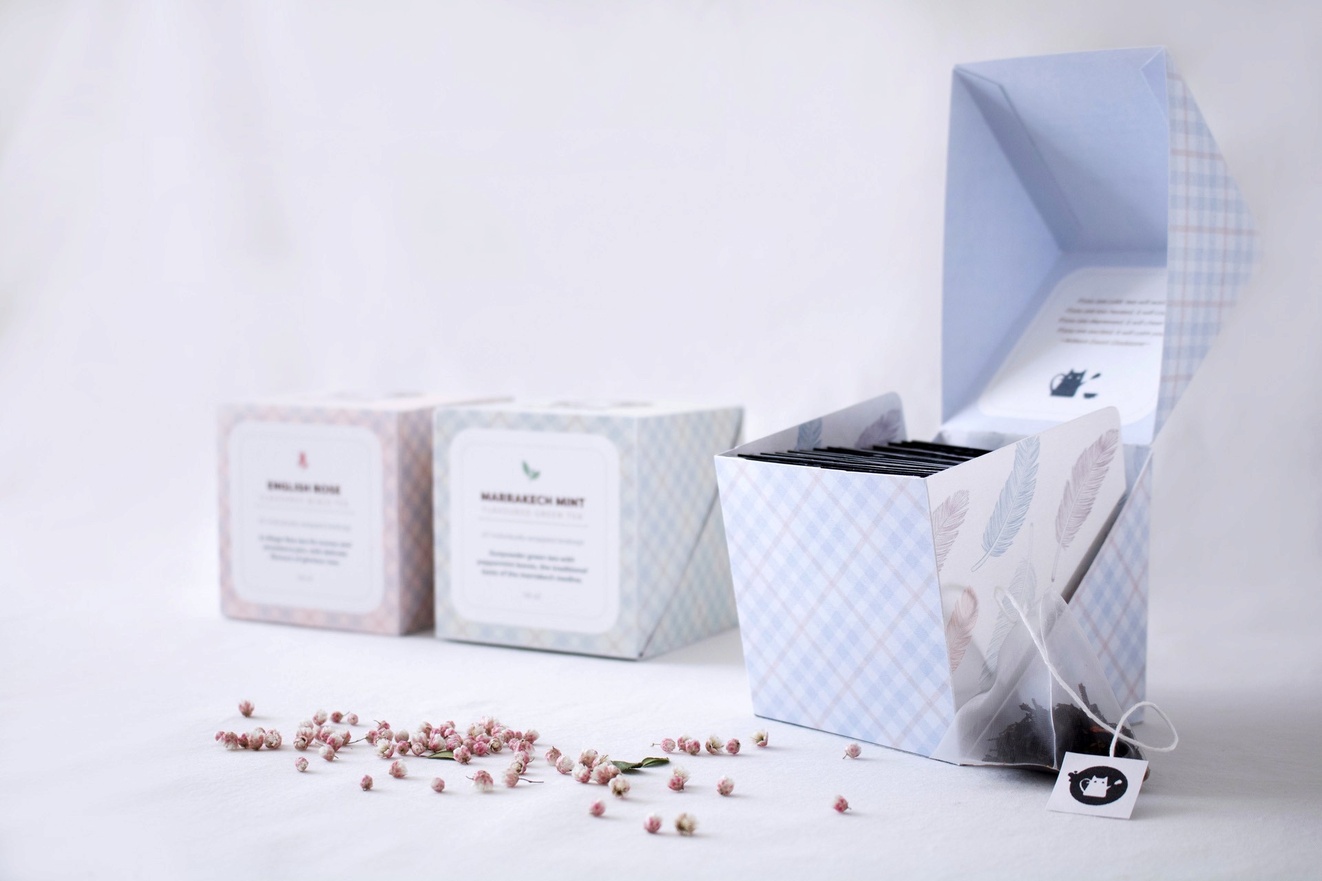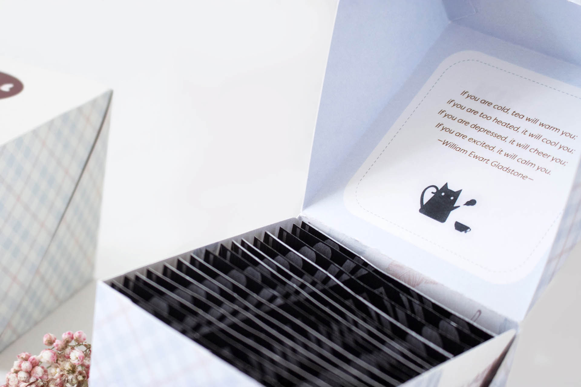 The packaging uses different colors and tea icons to distinguish the different kinds of teas. The icons on the logo will also change according to the tea. The feather pattern inside shows the cat's playfulness and cuteness. There are different tea quotes and wishes in the tea box, full of love, warmth, and inspire every tea drinker.